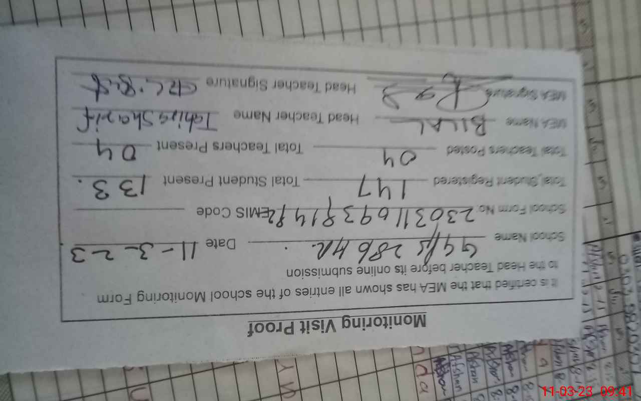 | Attendance Register | Head Teacher | MEA with School | Visit Proof |