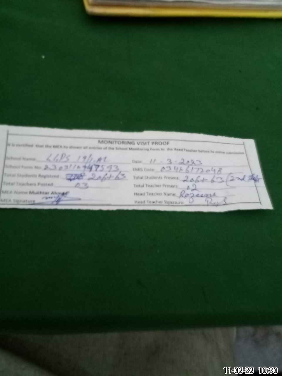 | Attendance Register | Head Teacher | MEA with School | Visit Proof |