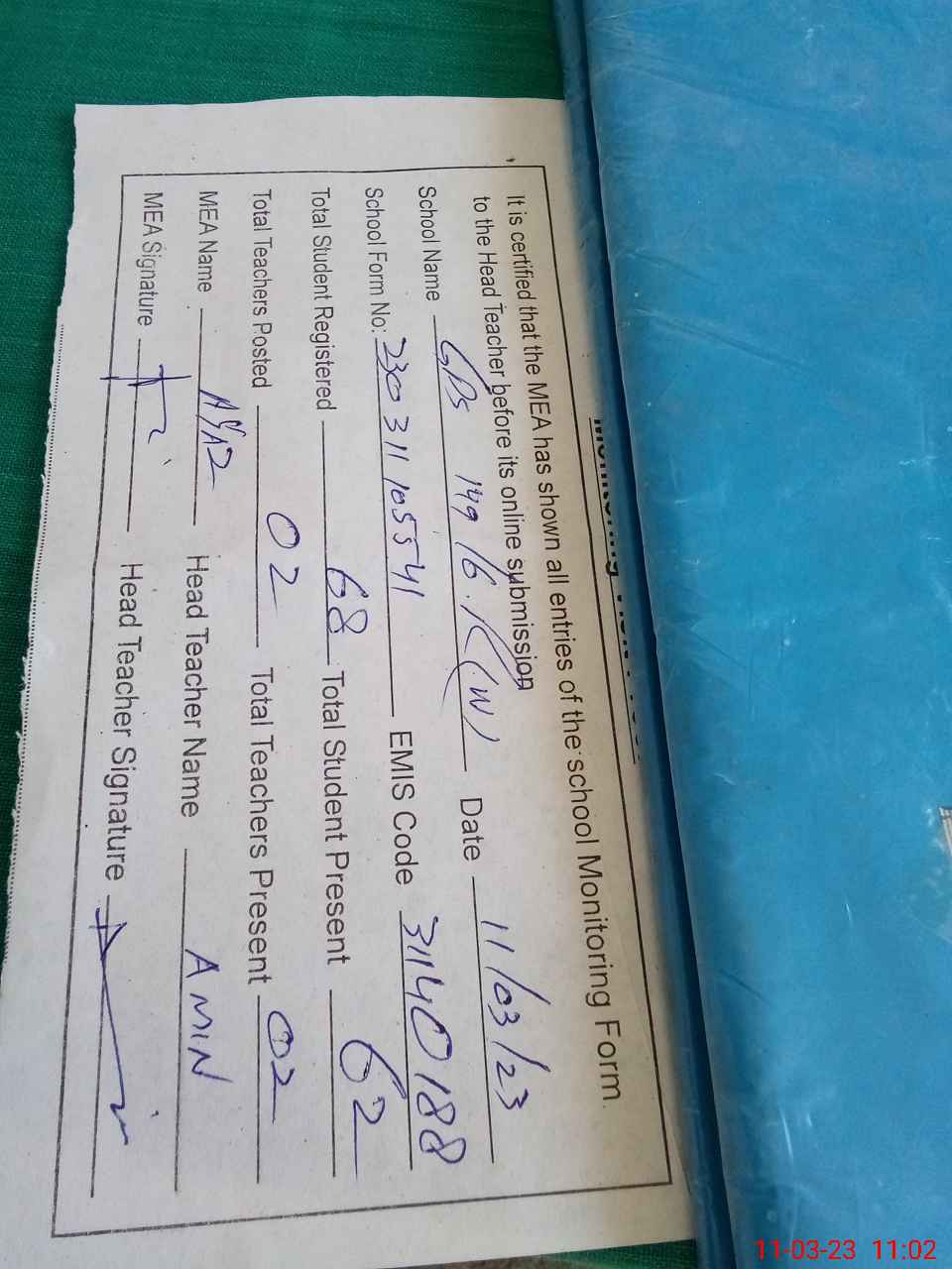 | Attendance Register | Head Teacher | MEA with School | Visit Proof |