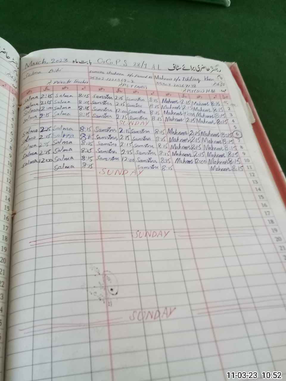 | CNIC | Full Name | Designation | R/C | Absence During Last Calender Month |