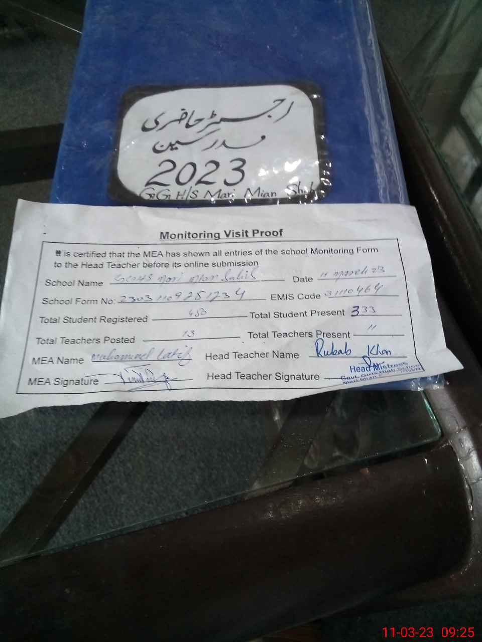 | Attendance Register | Head Teacher | MEA with School | Visit Proof |
