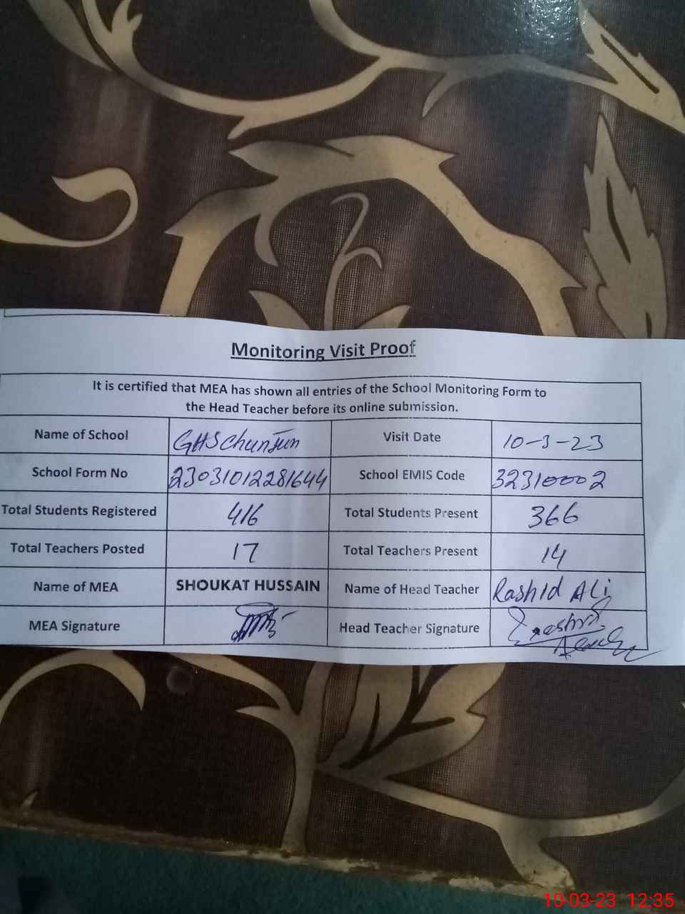 | Certified that this School was Inspected by the Undersigned MEA/DMO Today and the Information Stated Above is as Per Record. | |||||