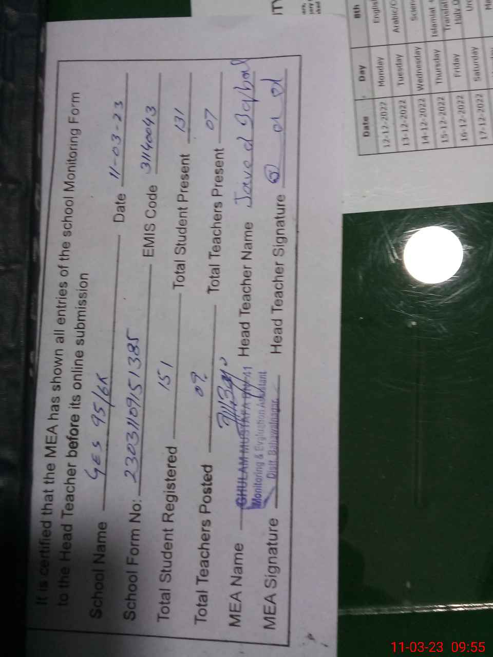 | Certified that this School was Inspected by the Undersigned MEA/DMO Today and the Information Stated Above is as Per Record. | |||||