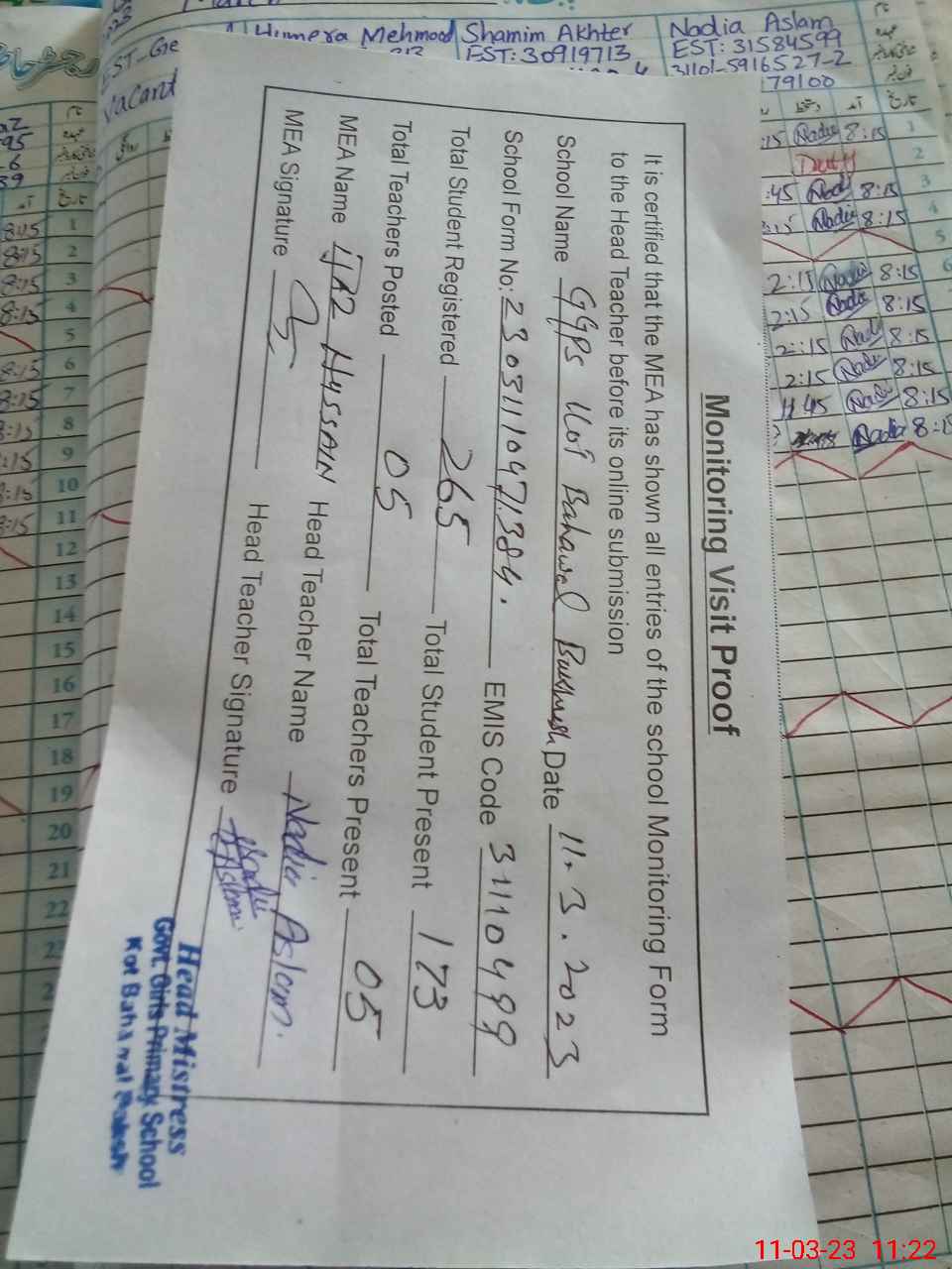 | Attendance Register | Head Teacher | MEA with School | Visit Proof |