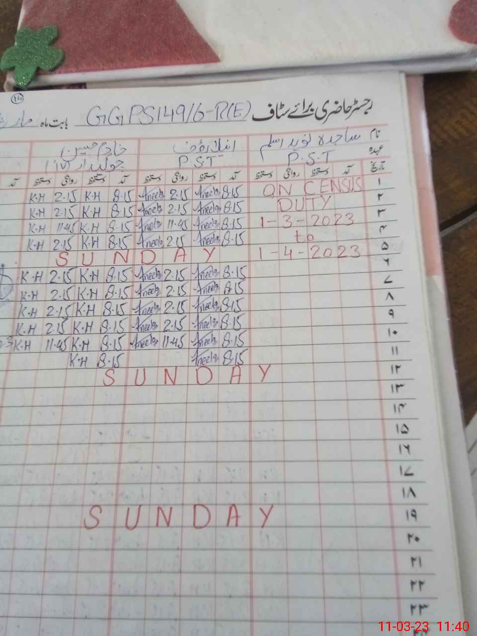 | CNIC | Full Name | Designation | R/C | Absence During Last Calender Month |