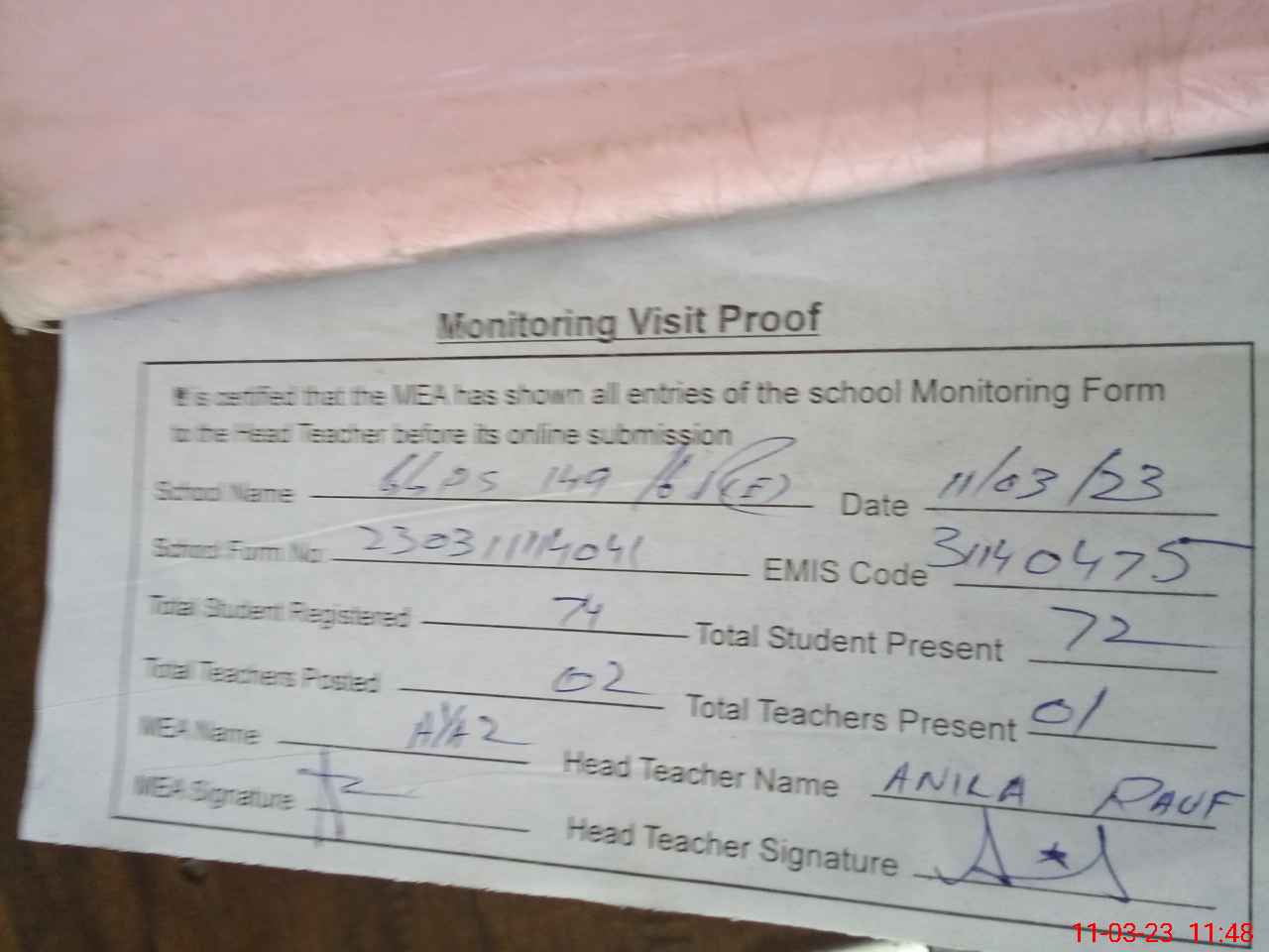 | Attendance Register | Head Teacher | MEA with School | Visit Proof |