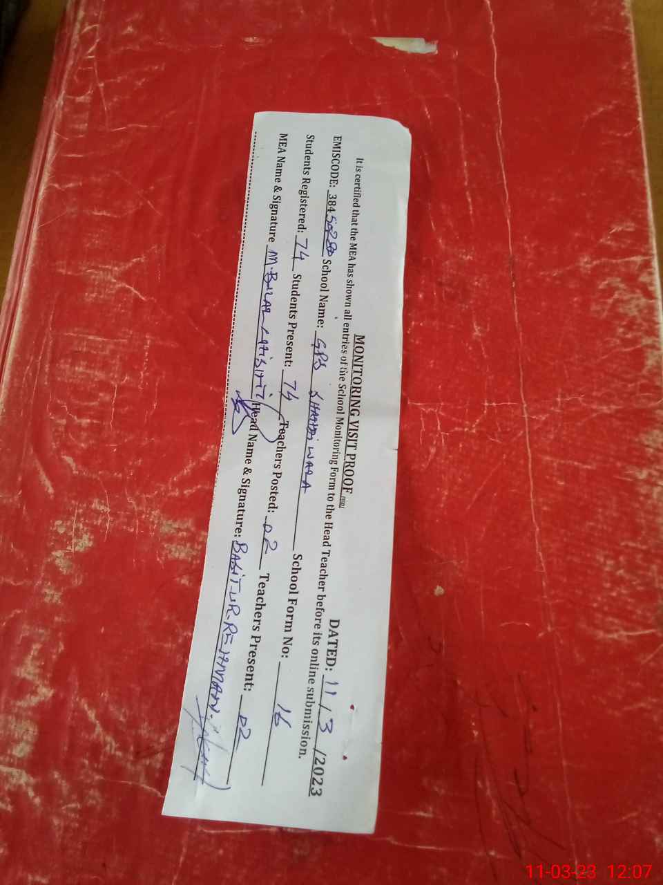 | Attendance Register | Head Teacher | MEA with School | Visit Proof |