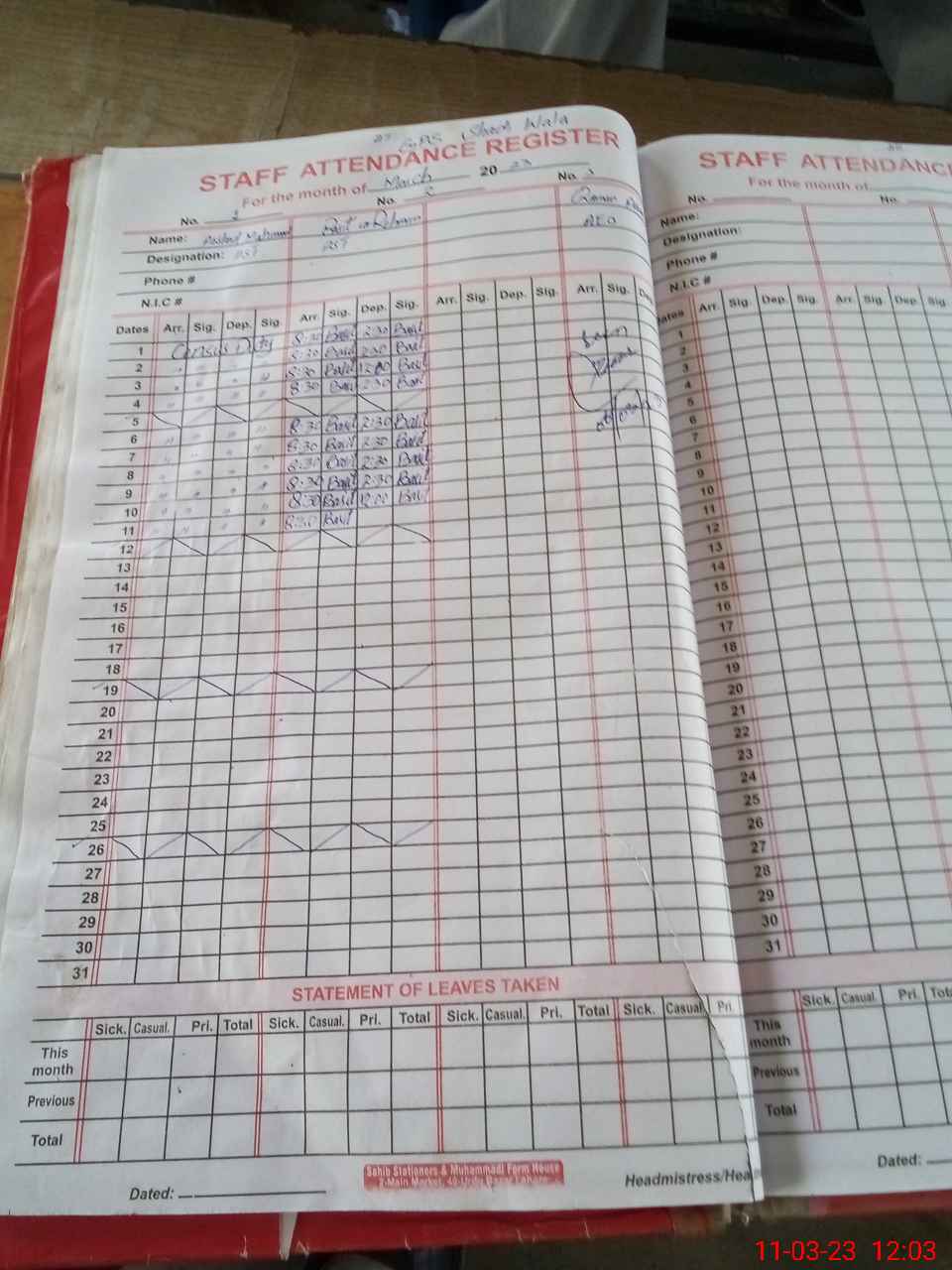 | Name: BA**** URRE**** Designation: (School Headmaster's/Headmistress's) PST Phone/Cell Number: 03**** |