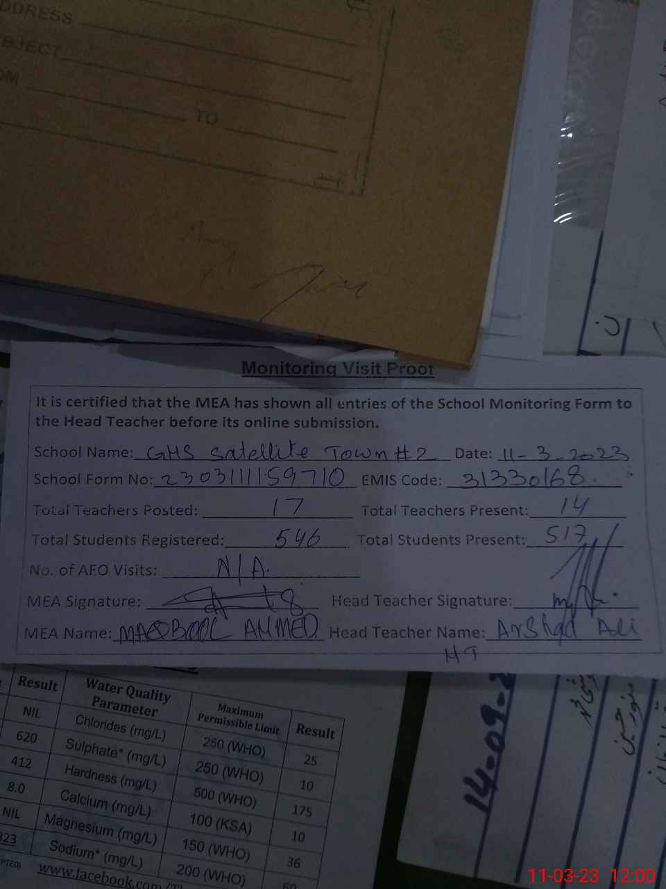 | EMIS Code: 31330168 | Name of School: GHS SETTLITE TOWN NO.2 GULSHAN-E-IQBAL | |||