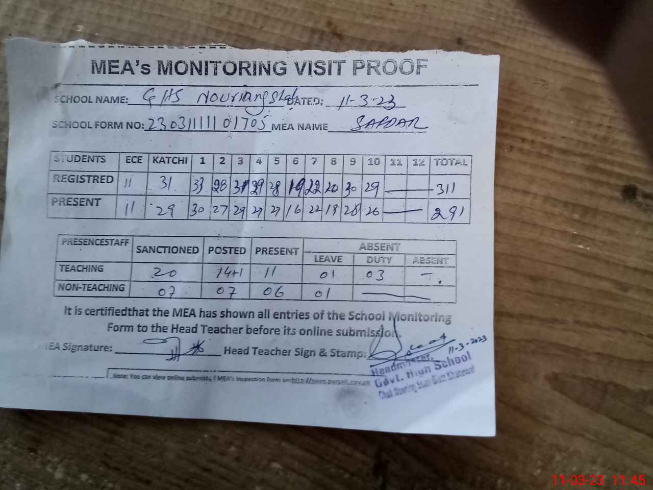 | Attendance Register | Head Teacher | MEA with School | Visit Proof |