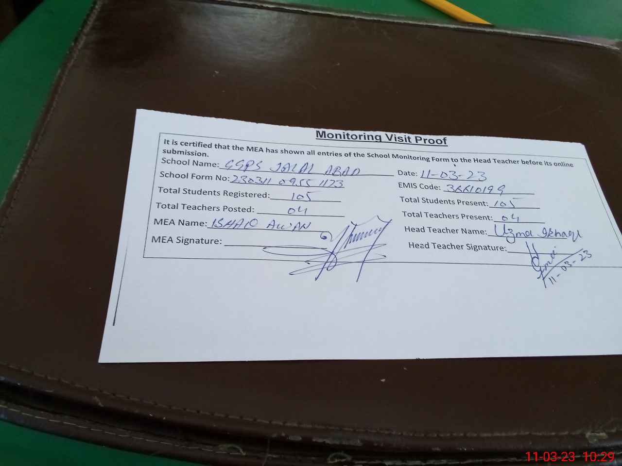 | Attendance Register | Head Teacher | MEA with School | Visit Proof |