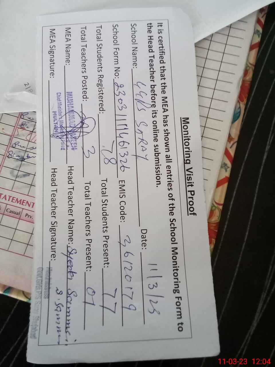 | EMIS Code: 36120179 | Name of School: GGPS SARAY TEH.SHUJABAD | |||