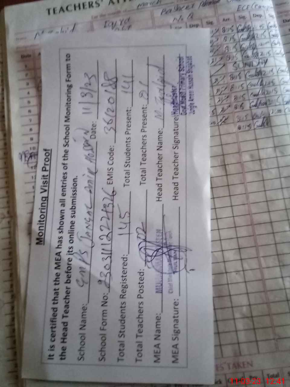 | Attendance Register | Head Teacher | MEA with School | Visit Proof |