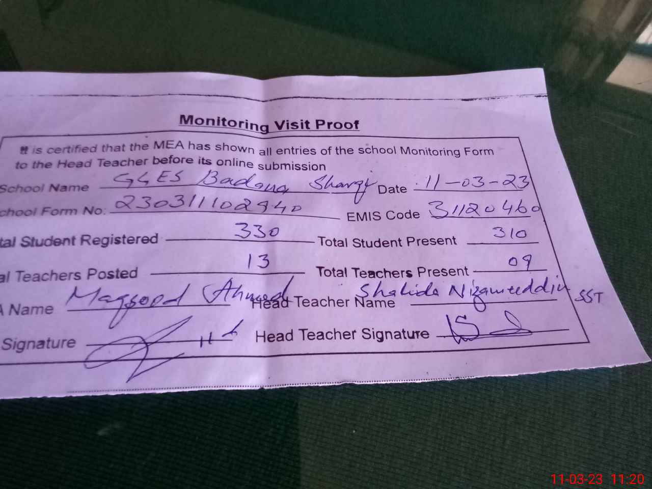 | Attendance Register | Head Teacher | MEA with School | Visit Proof |