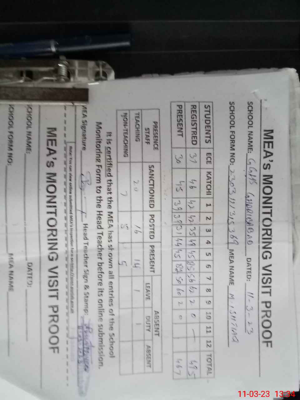 | Attendance Register | Head Teacher | MEA with School | Visit Proof |