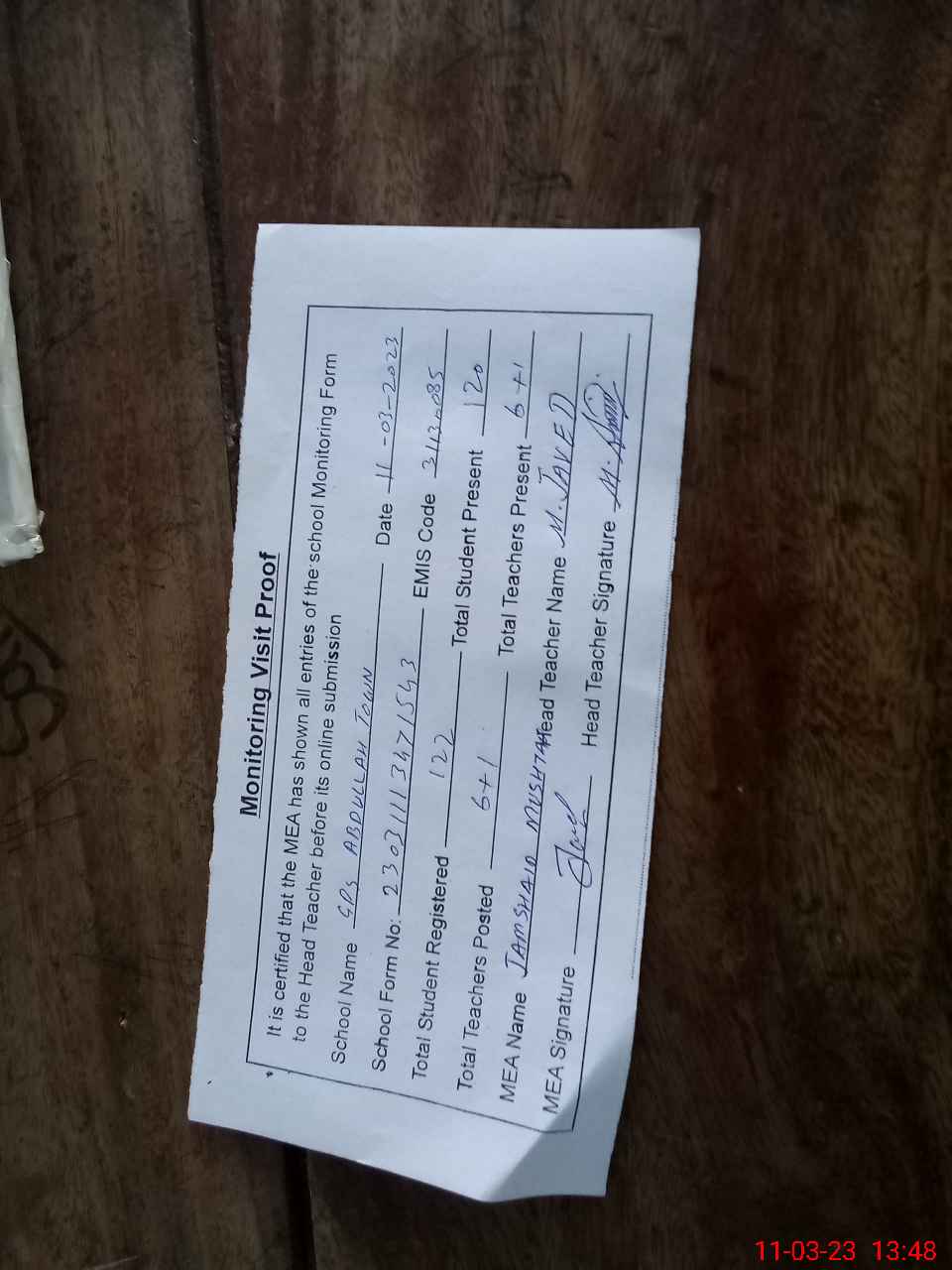 | Attendance Register | Head Teacher | MEA with School | Visit Proof |