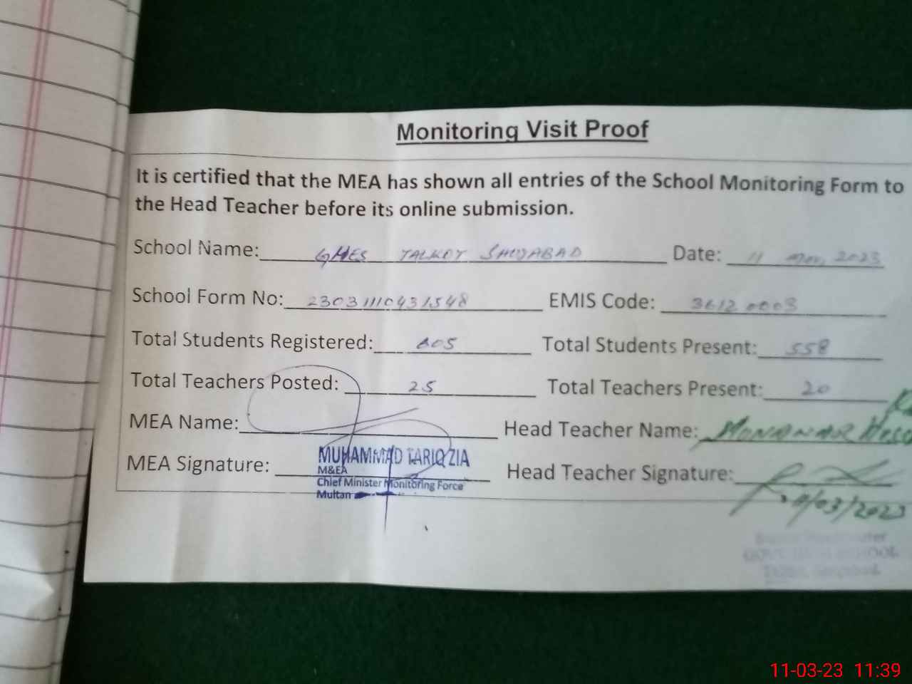 | Attendance Register | Head Teacher | MEA with School | Visit Proof |