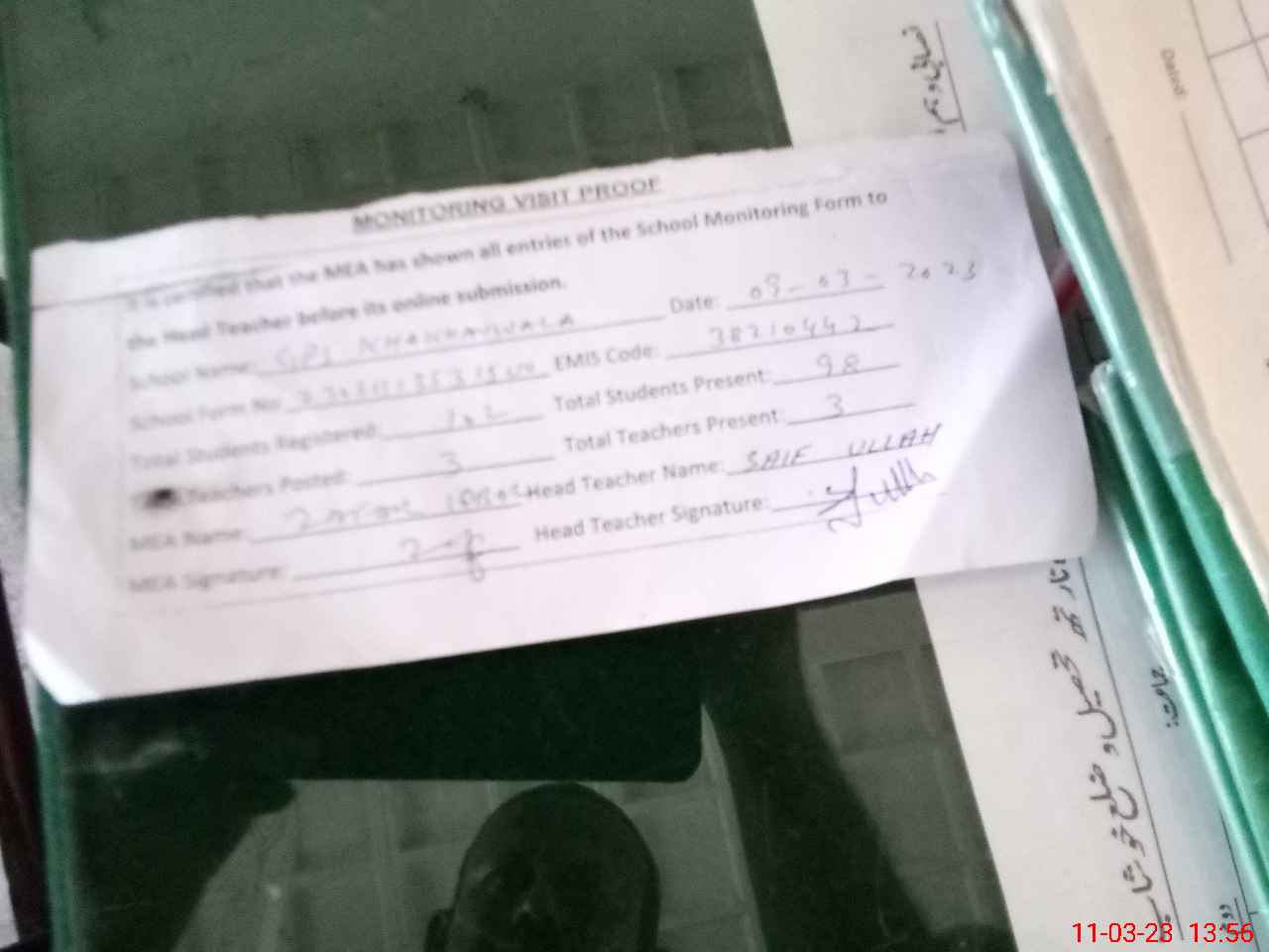 | Attendance Register | Head Teacher | MEA with School | Visit Proof |