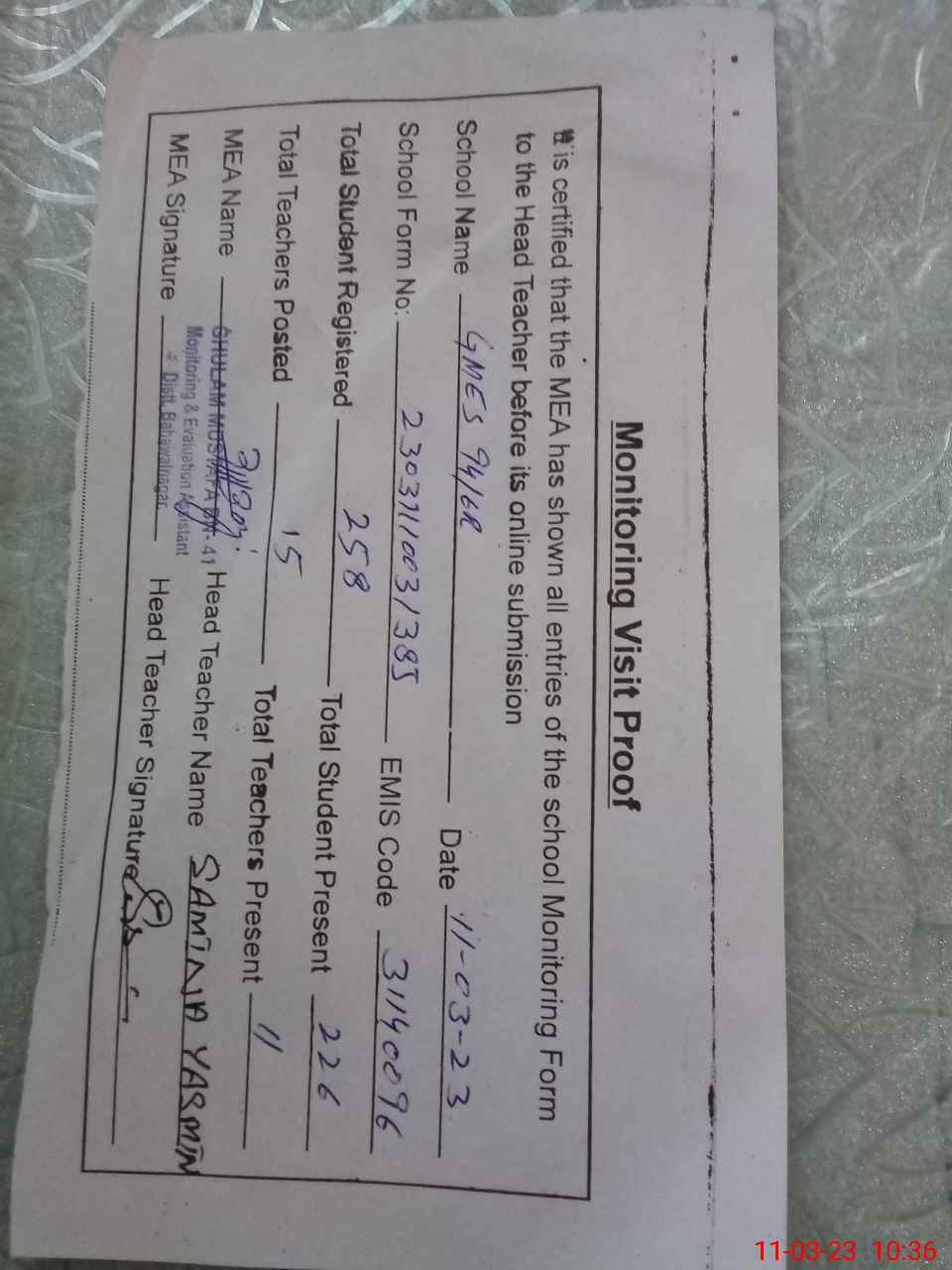 | Attendance Register | Head Teacher | MEA with School | Visit Proof |