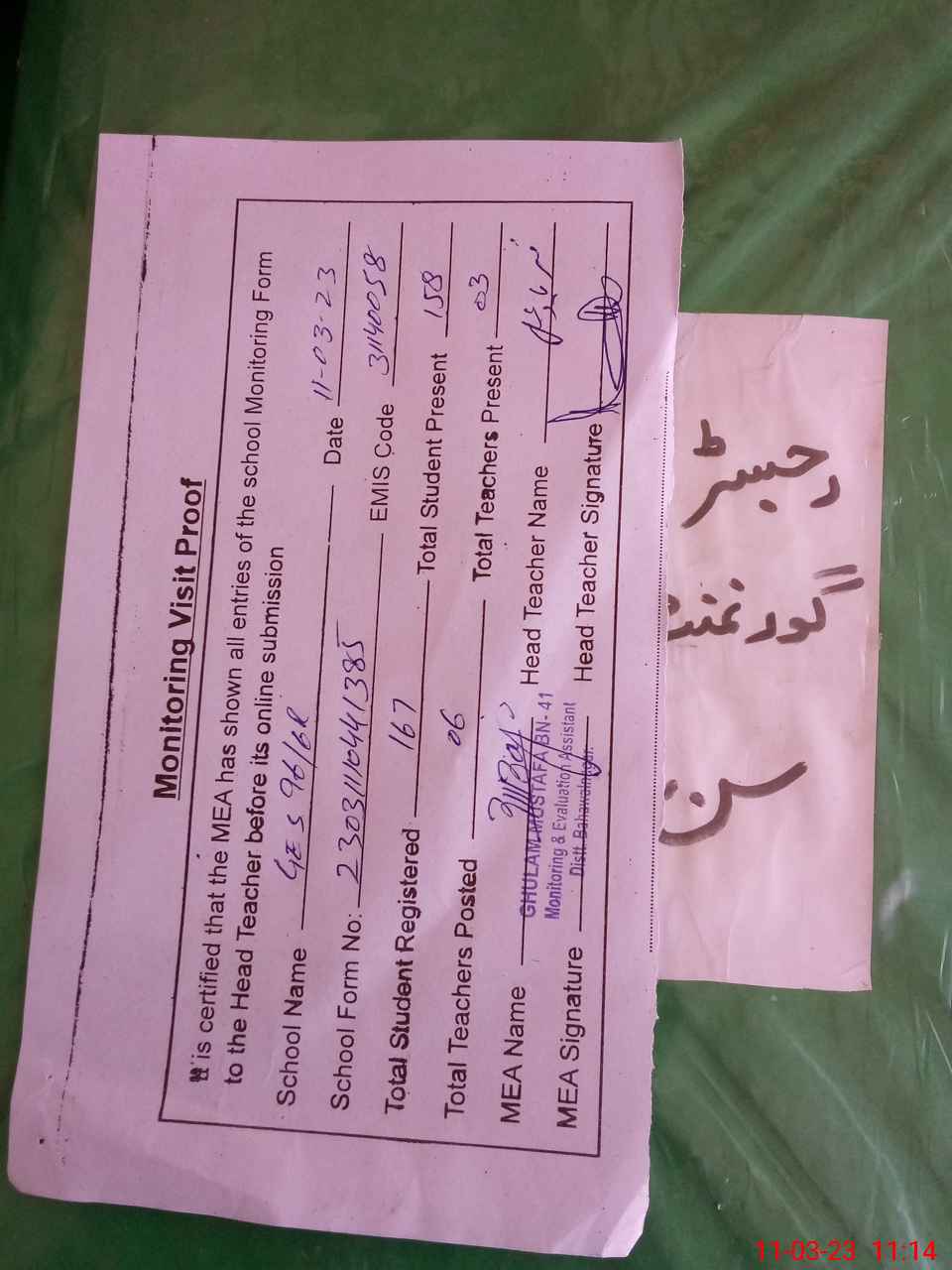 | EMIS Code: 31140058 | Name of School: GES CHAK NO. 96/6-R | |||