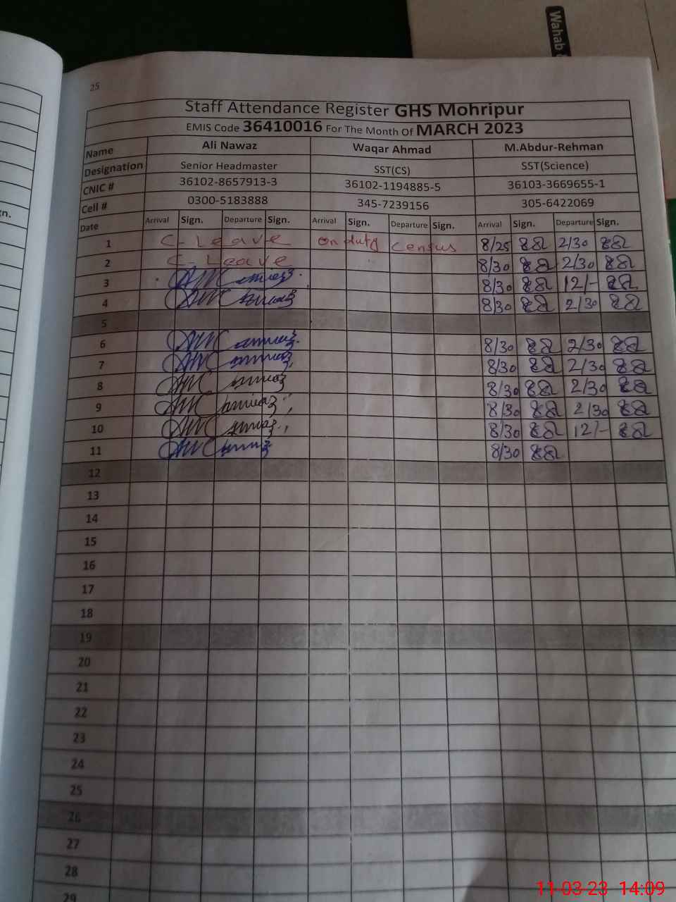 | CNIC | Full Name | Designation | R/C | Absence during last cal. month |