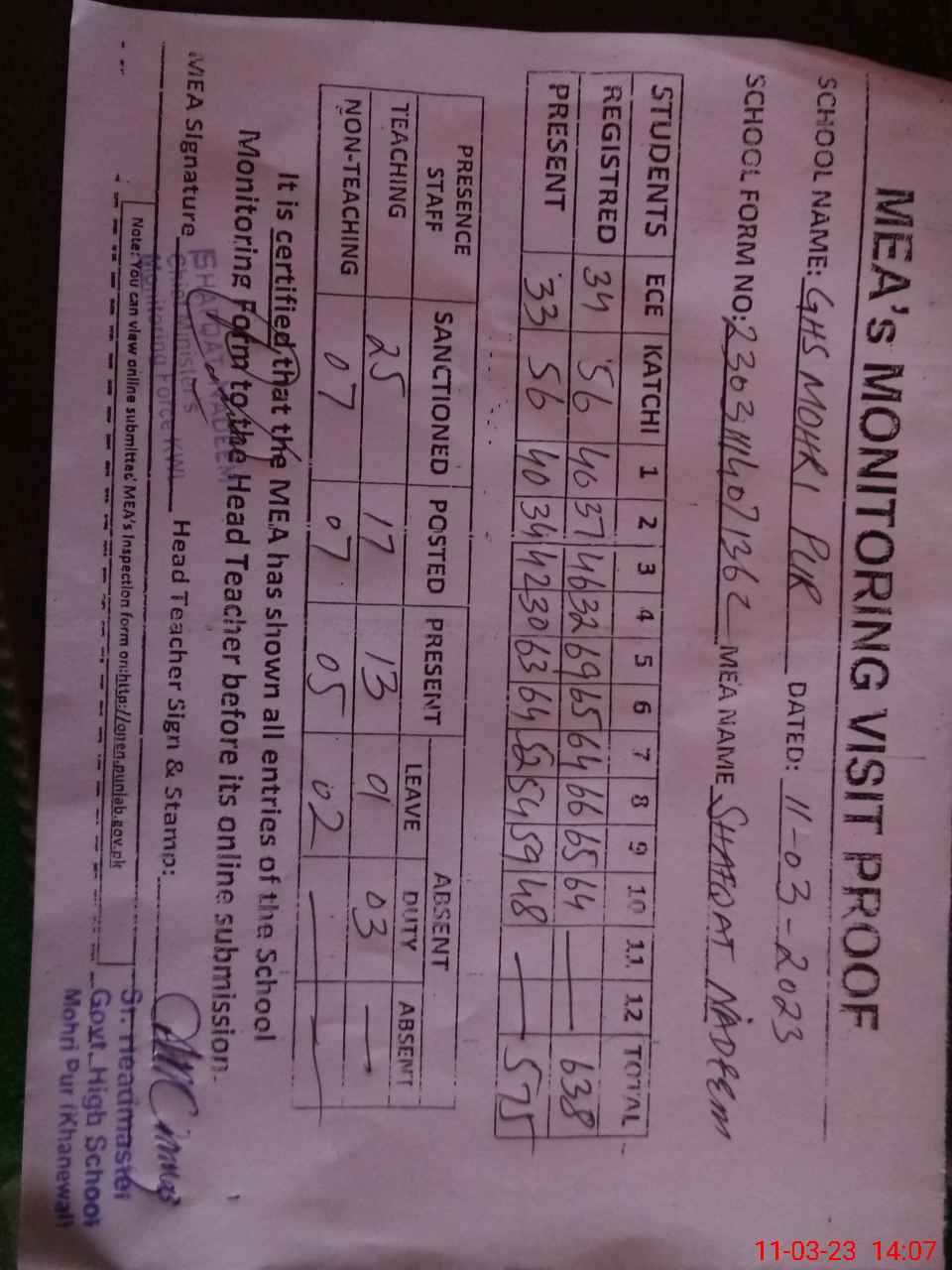 | Attendance Register | Head Teacher | MEA with School | Visit Proof |
