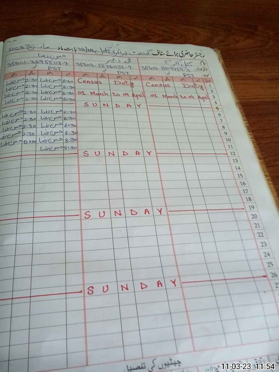 | CNIC | Full Name | Designation | R/C | Absence During Last Calender Month |