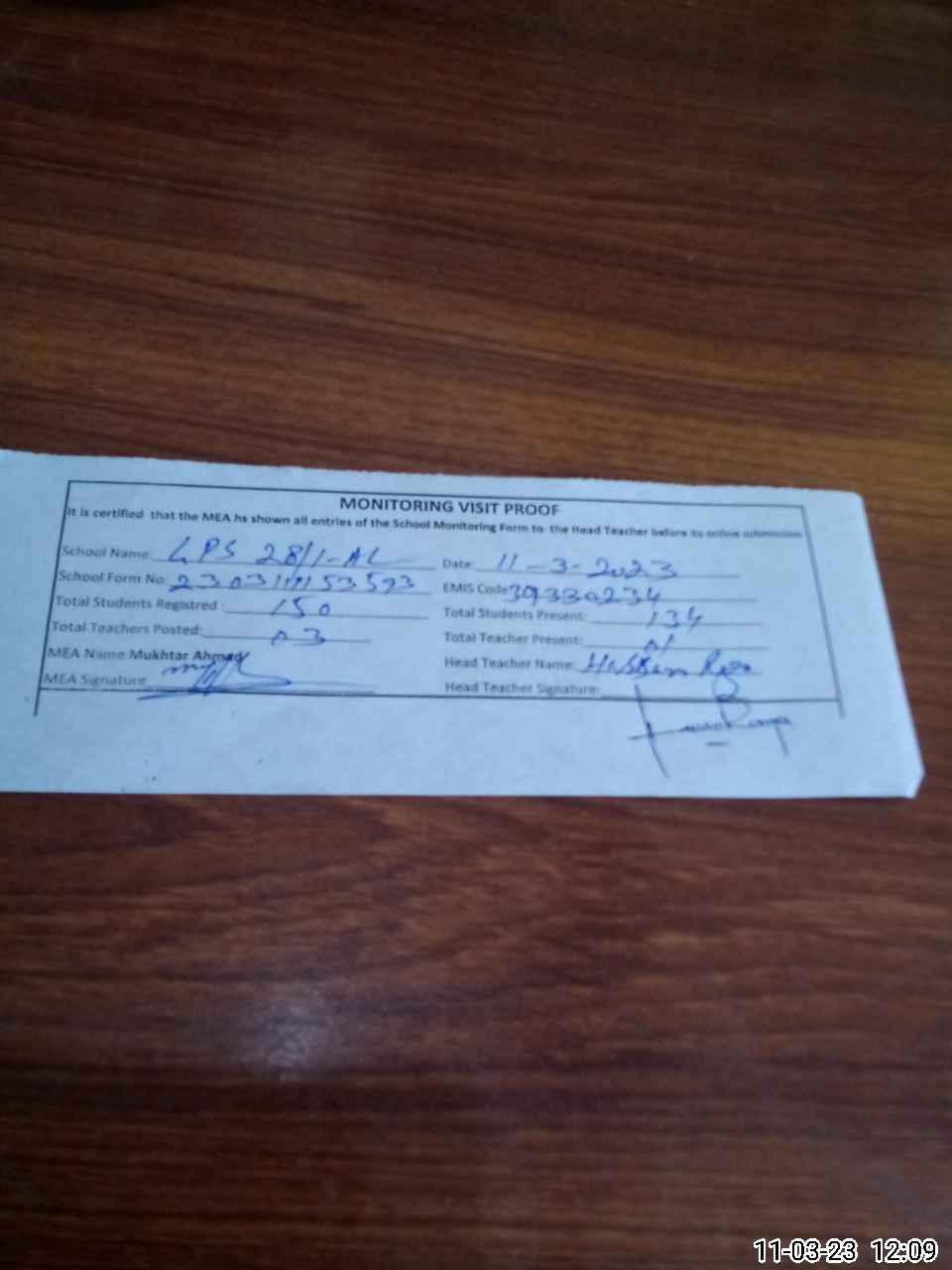| Attendance Register | Head Teacher | MEA with School | Visit Proof |