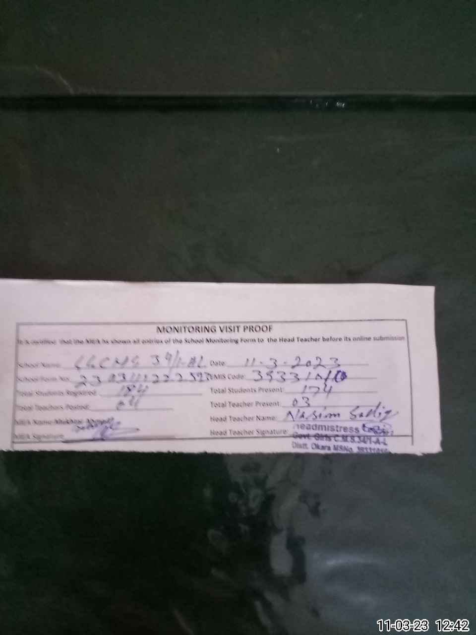 | Attendance Register | Head Teacher | MEA with School | Visit Proof |