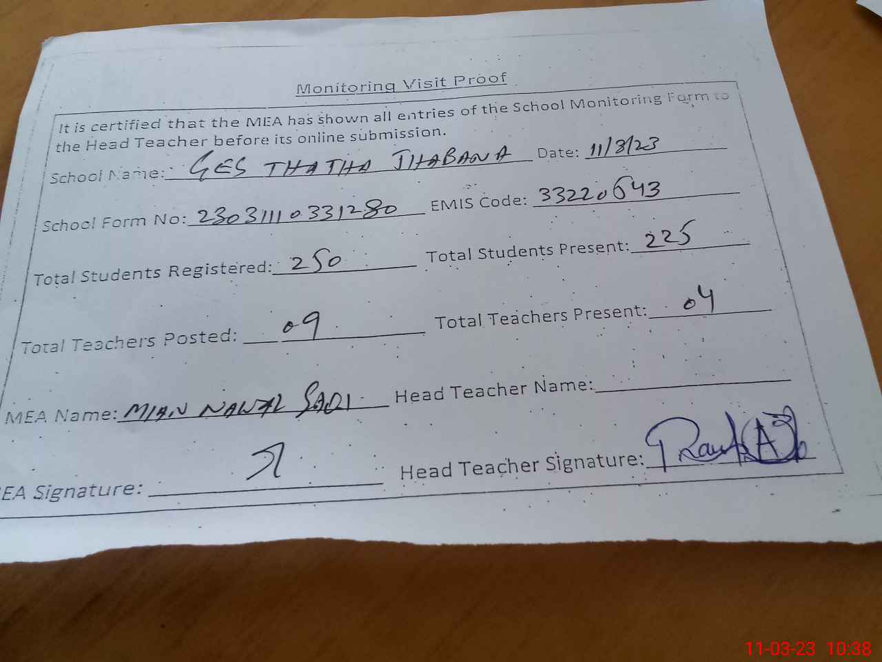 | Attendance Register | Head Teacher | MEA with School | Visit Proof |