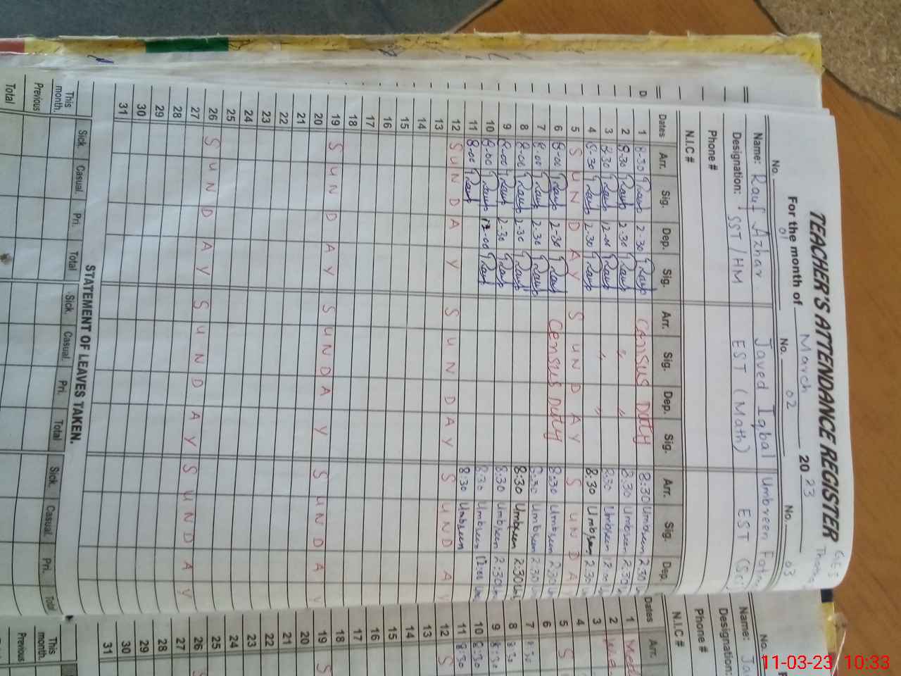 | 33**** | Sa**** Al**** Sh**** | EST | Regular | 0 | 0 | 0 | 0 | 0 | 0 | 0 | 0 | 0 | Absent (Un-Authorized) |