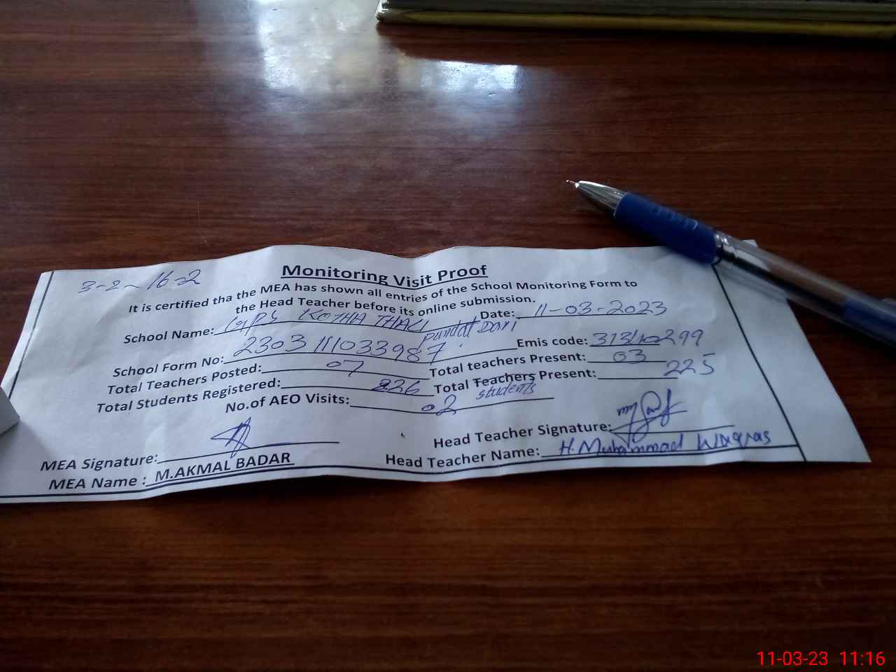 | Attendance Register | Head Teacher | MEA with School | Visit Proof |