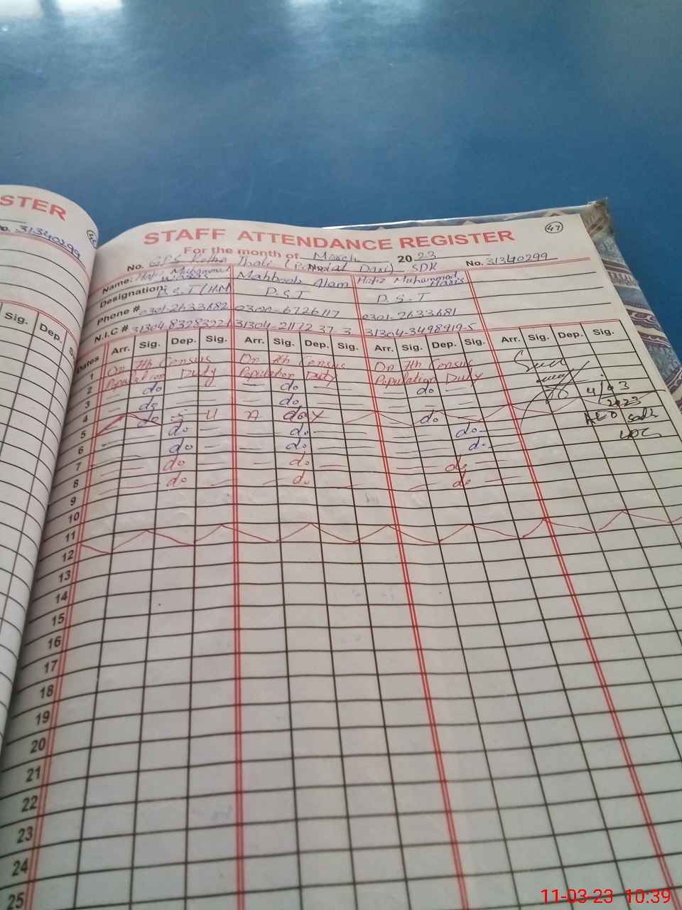 | CNIC | Full Name | Designation | R/C | Absence during last cal. month |
