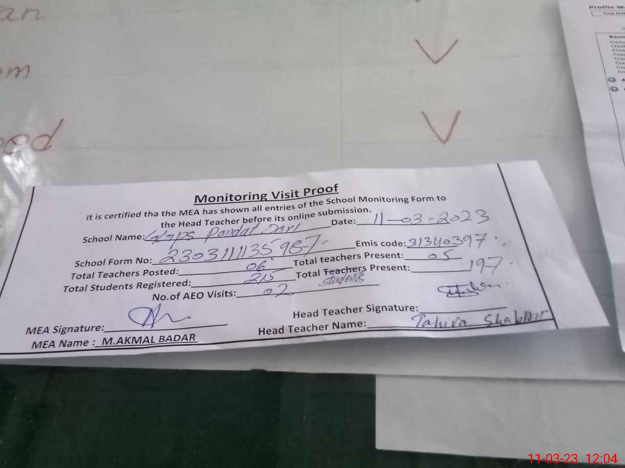 | Attendance Register | Head Teacher | MEA with School | Visit Proof |