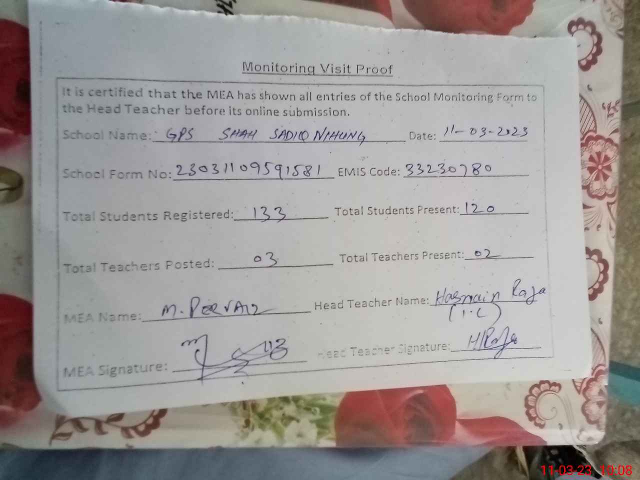 | EMIS Code: 33230780 | Name of School: GPS SHAH SADIQ NIHUNG | |||