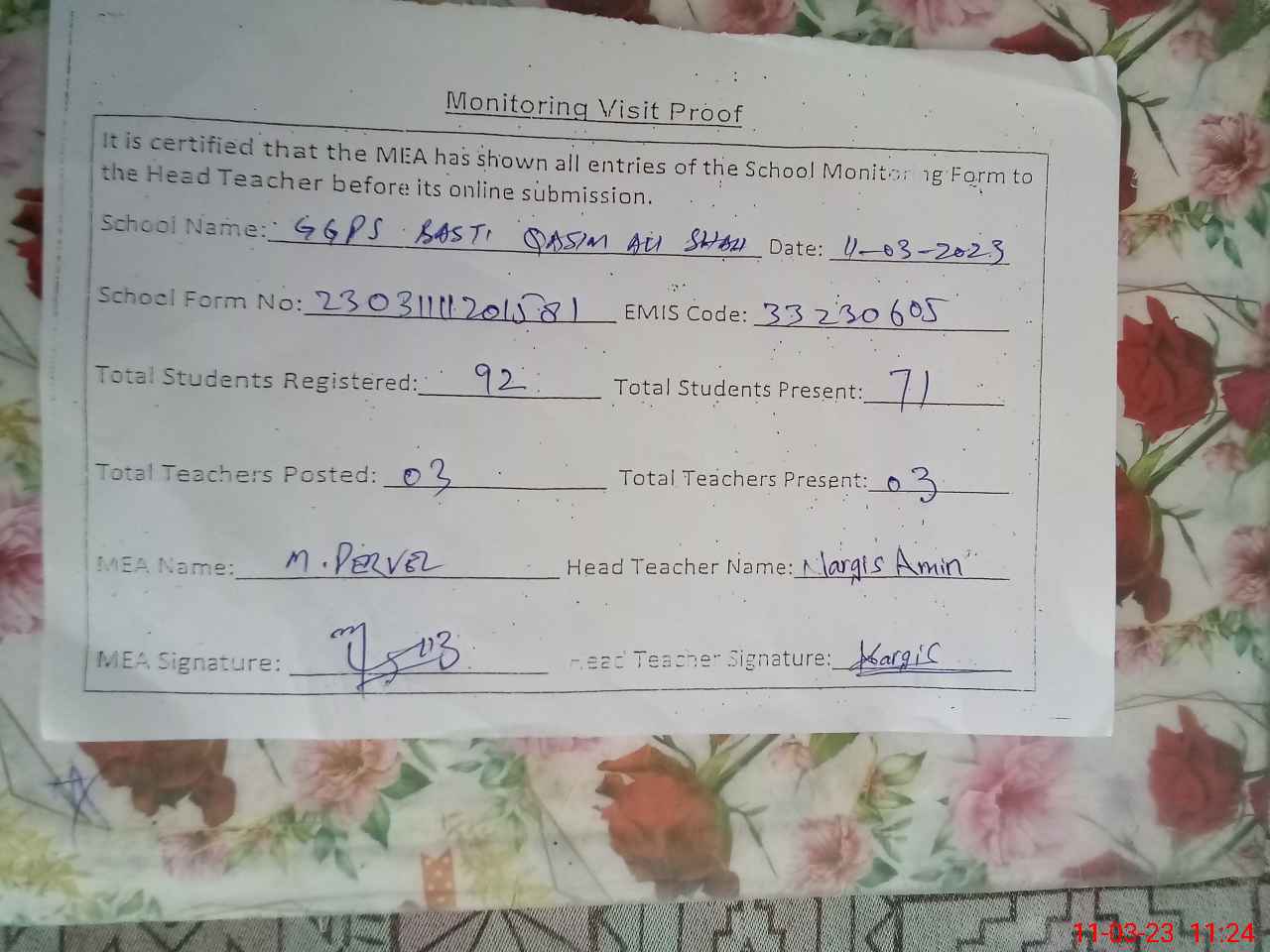 | Attendance Register | Head Teacher | MEA with School | Visit Proof |