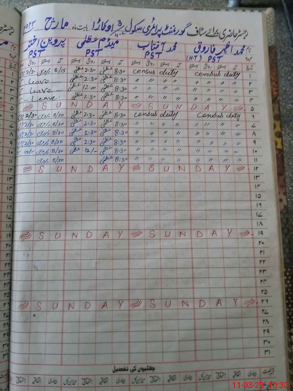 | Remarks (Use Separate Page if Required): PST Murad Ali is present in the school but no intry in the teachers colum PST Sajid Ayub on duty but no intry in the teachers colum | |||||