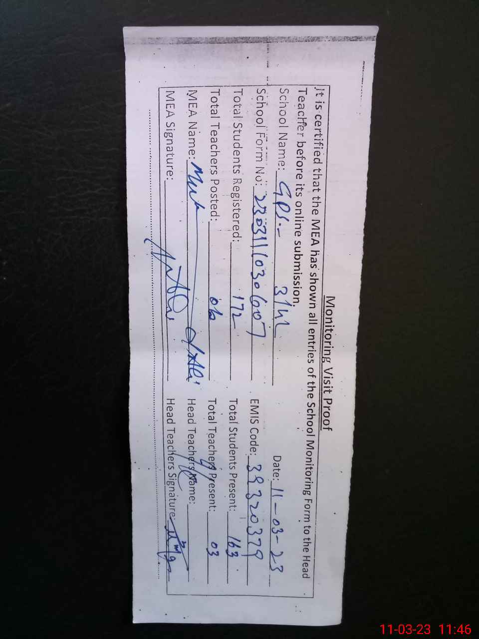 | Attendance Register | Head Teacher | MEA with School | Visit Proof |