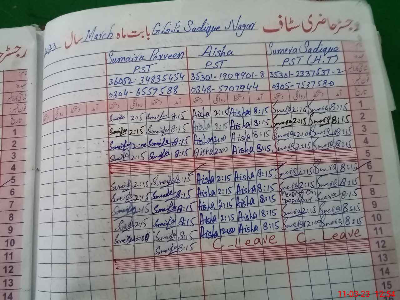 | CNIC | Full Name | Designation | R/C | Absence During Last Calender Month |