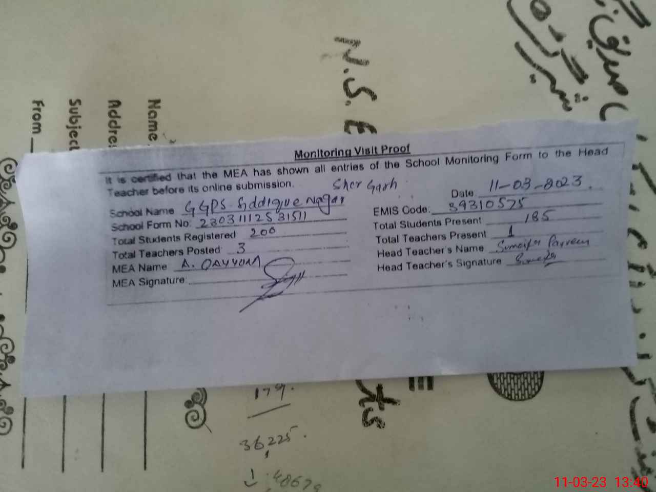 | Attendance Register | Head Teacher | MEA with School | Visit Proof |