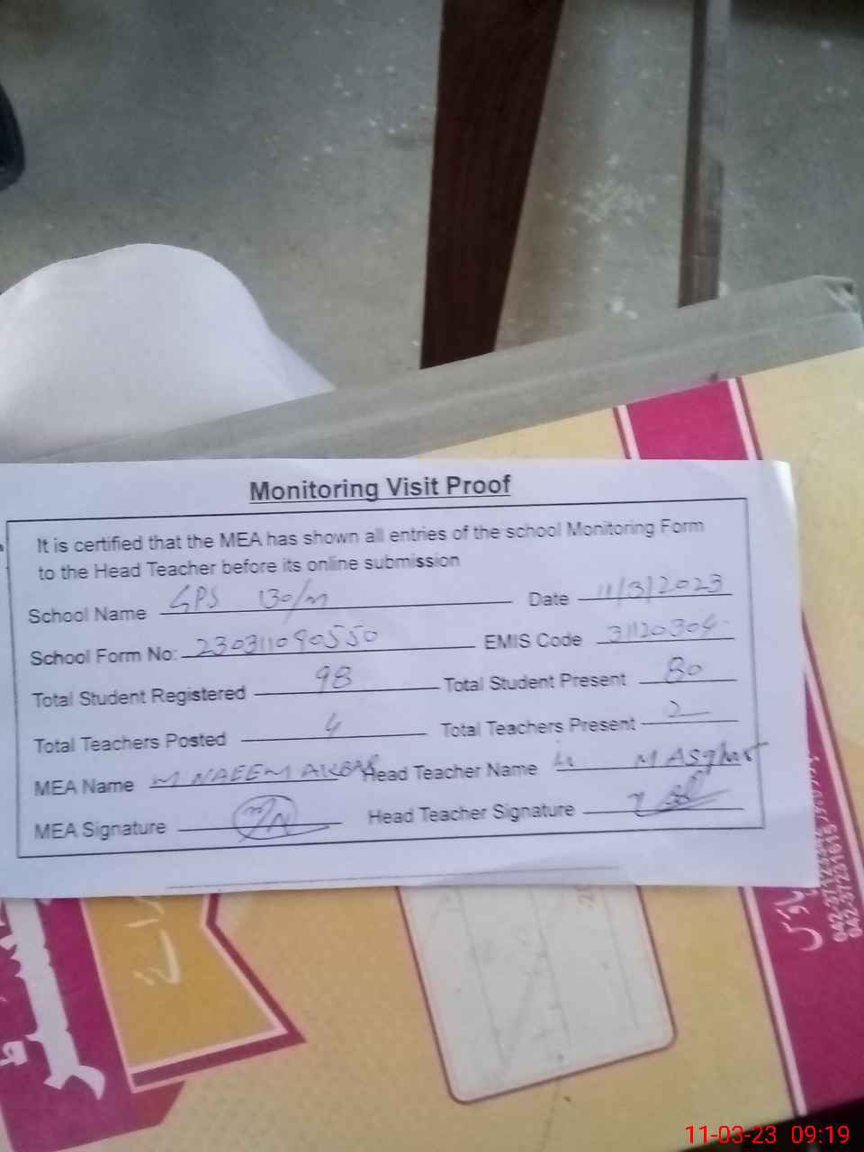| Attendance Register | Head Teacher | MEA with School | Visit Proof |