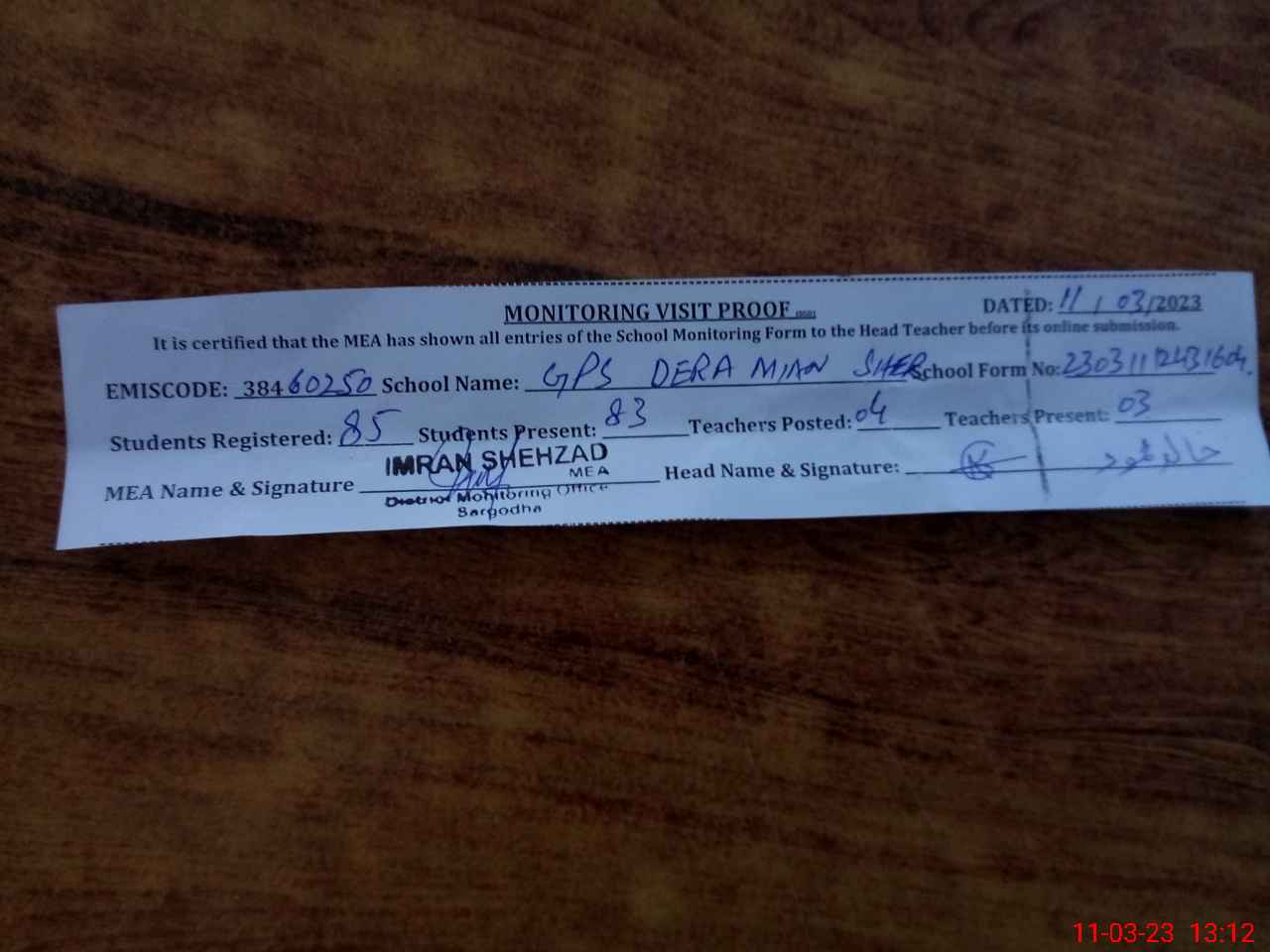 | EMIS Code: 38460250 | Name of School: GPS DERA MIAN SHER | |||