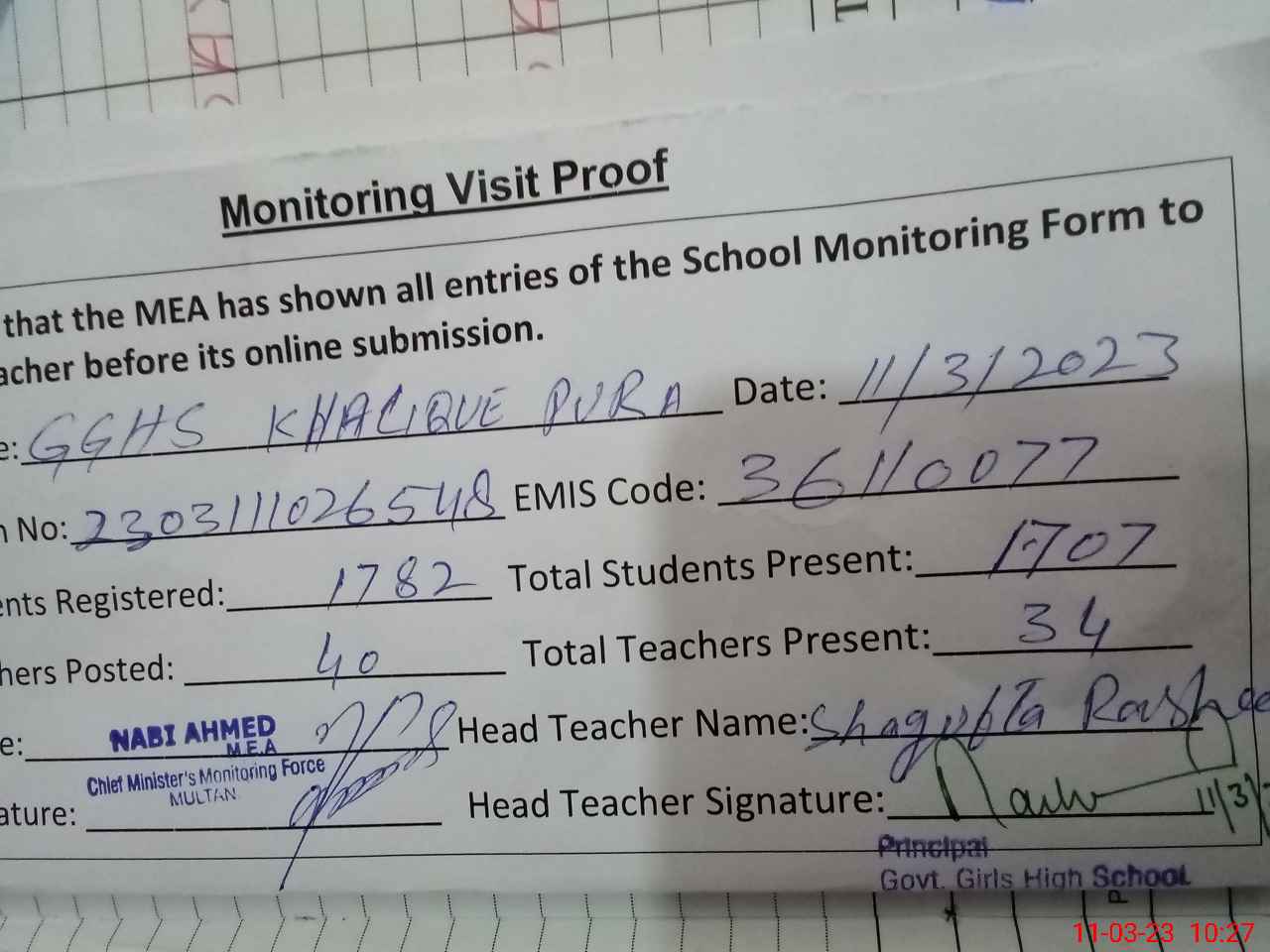 | EMIS Code: 36110077 | Name of School: GGHS KHALIQUE PURA KHALIQUE PURA | |||