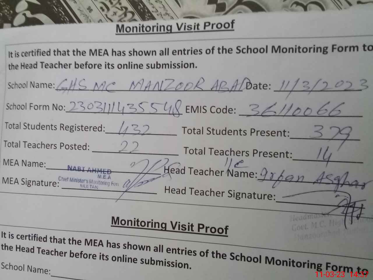 | Attendance Register | Head Teacher | MEA with School | Visit Proof |