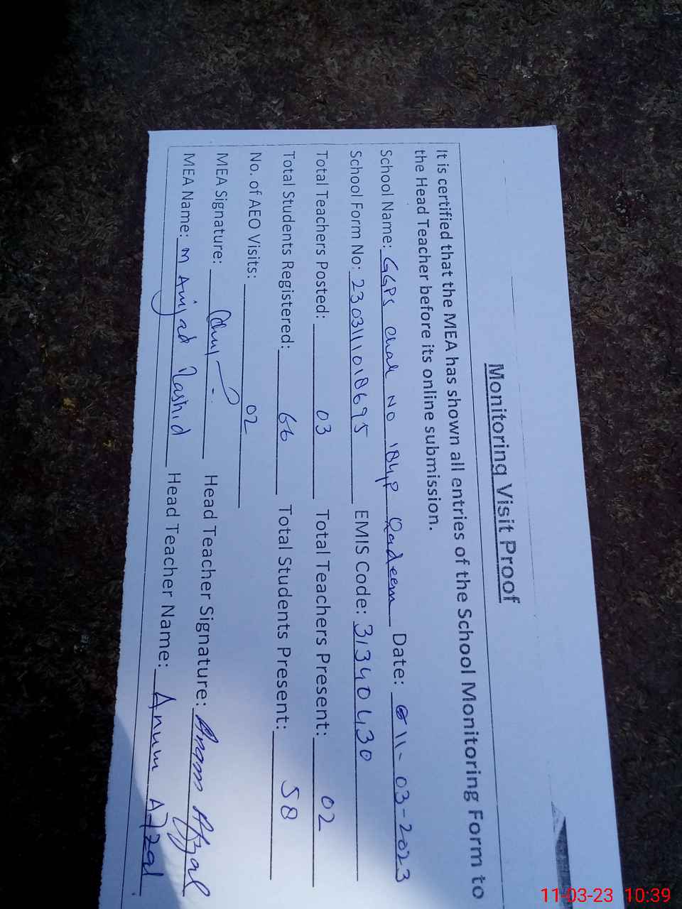 | Attendance Register | Head Teacher | MEA with School | Visit Proof |
