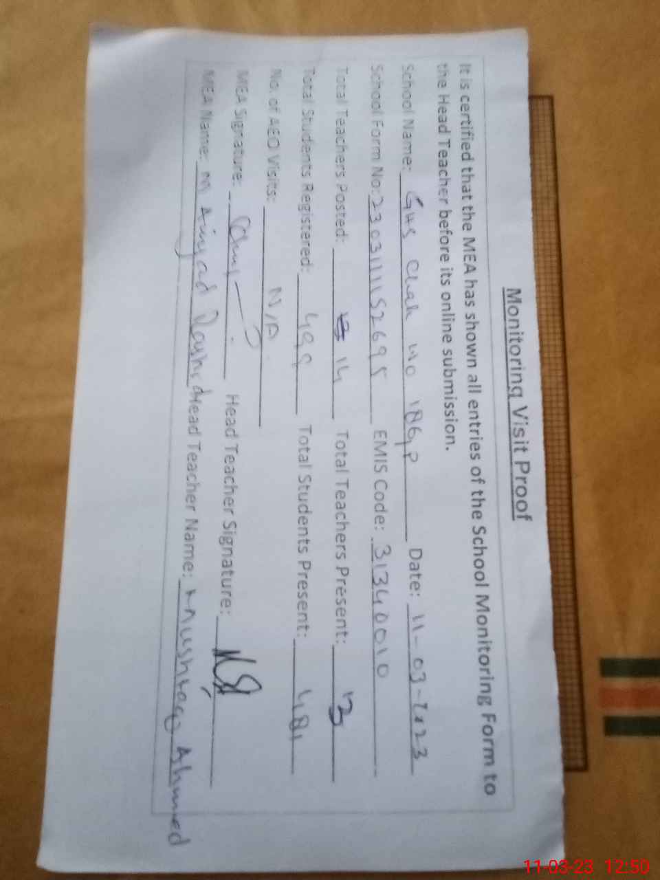 | Attendance Register | Head Teacher | MEA with School | Visit Proof |