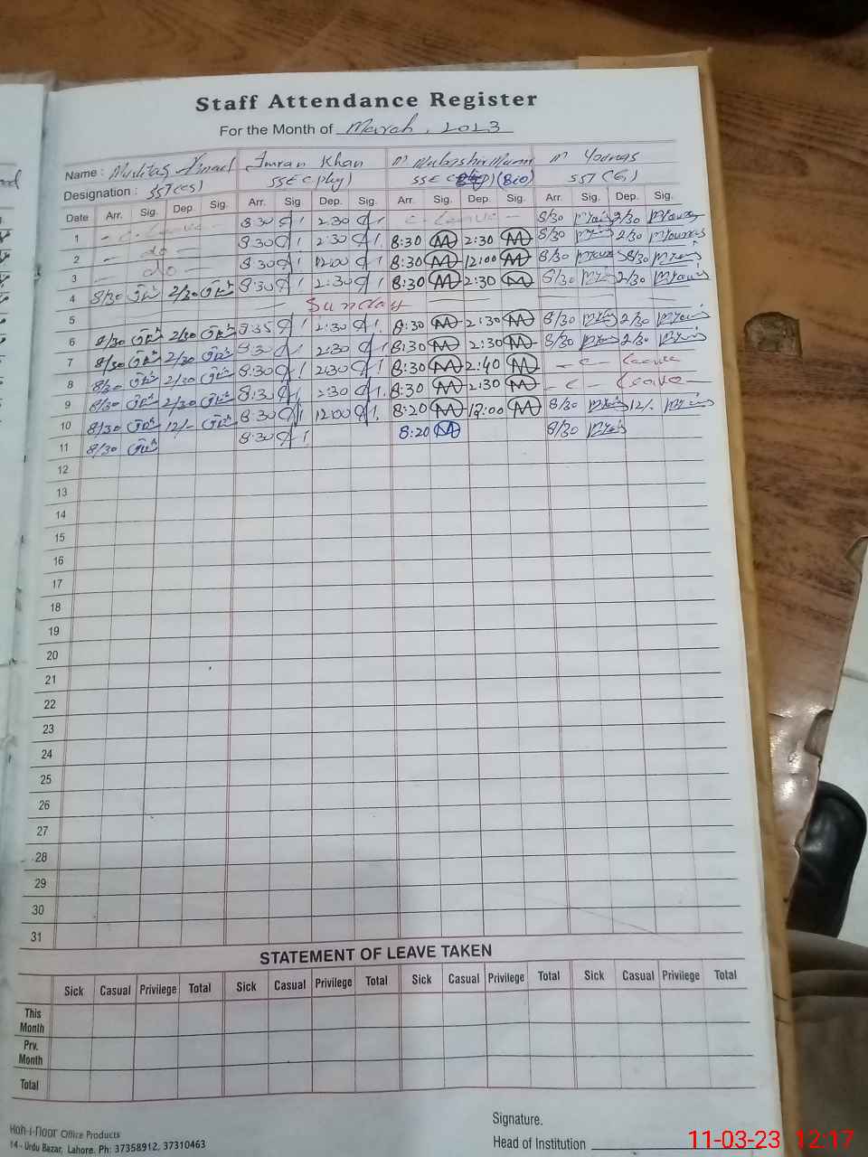 | Remarks (Use Separate Page if Required): Lnd not conducted because of class three is on exam off Qari Muhammad Abdullah is posted to this school since August 2022 but not yet actioned on sis | |||||