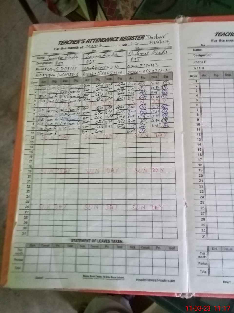 | Name: Su**** Qa**** Designation: (School Headmaster's/Headmistress's) PST Phone/Cell Number: 03**** |