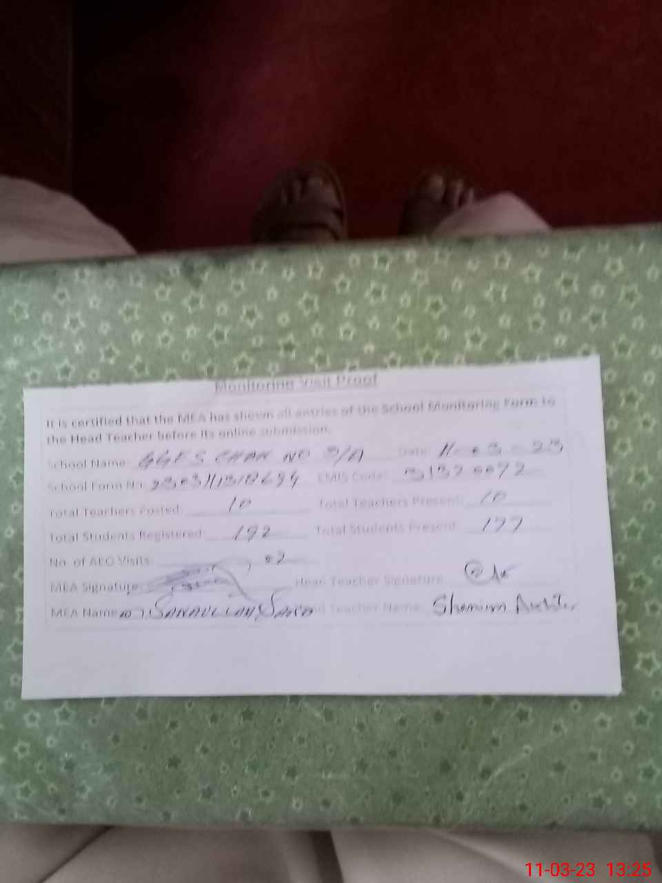 | Attendance Register | Head Teacher | MEA with School | Visit Proof |