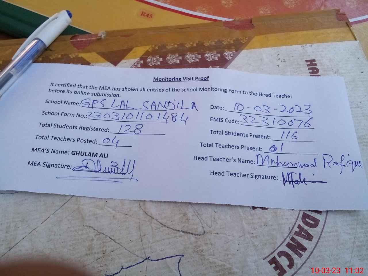 | Attendance Register | Head Teacher | MEA with School | Visit Proof |
